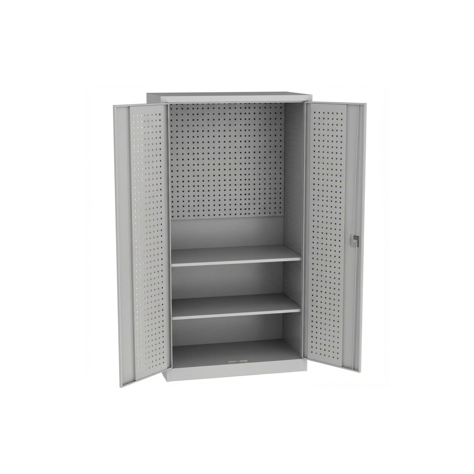 For workshop pros, every minute counts: the back panel and the inside faces of the doors are perforated, allowing tools, holders, or accessories to be clearly organized on the wall surface. Frequently used items hang visibly at eye level, while heavy material stays neatly stored in the cabinet. Two painted shelves are height-adjustable and each supports up to 100 kg—ideal for machine cases, spare parts, measuring instruments, or consumables. The flexible layout lets the cabinet grow with your tasks: assortment boxes today, power tools tomorrow, maintenance kits next week.