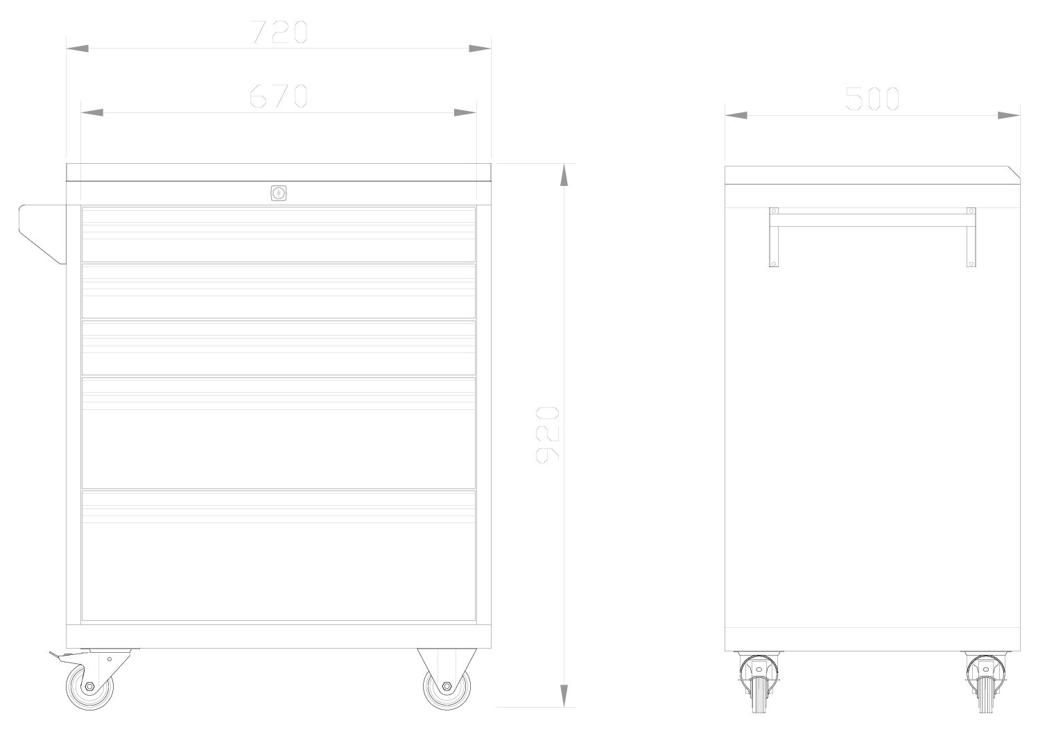 Order, safety, and quick access often determine pace and quality in everyday workshop work. This tool trolley with 5 drawers comes equipped with precisely that in mind: compact dimensions of 920 x 720 x 500 mm (H x W x D), a solid 80 kg load capacity per drawer, and 80% extension, so tools and accessories remain clearly organized and within easy reach—without the trolley taking up unnecessary space.