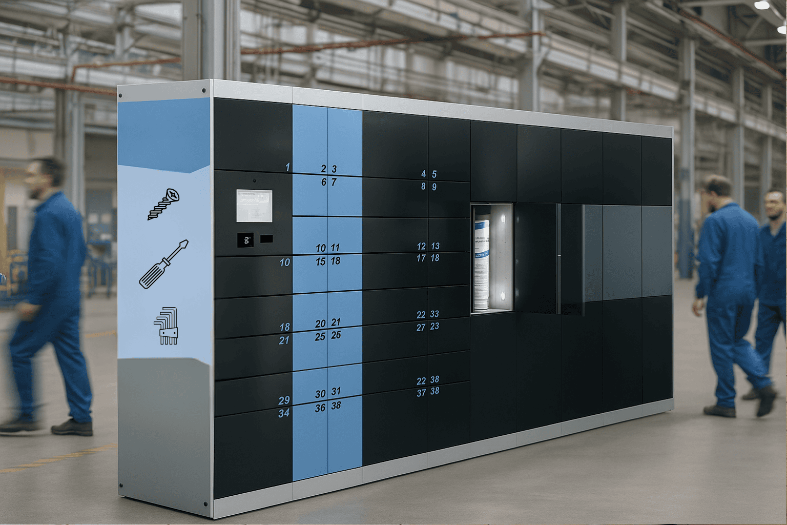 Inventory management Automatic recording of material withdrawals and returns; real-time stock tracking; minimum stock warnings with automatic reordering function; weight sensors for automatic quantity recording (optional); batch tracking and serial number management.